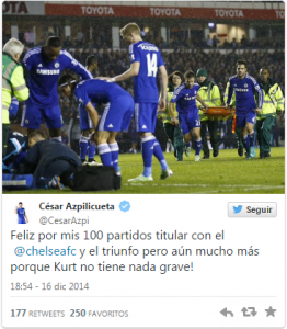 Kurt Zouma chocó con su compañero de equipo Cech y quedó inmediatamente desplomado inconsciente durante 3 minutos en el suelo. Sin embargo, el encontronazo sólo le hizo perder un diente sin consecuencias graves.